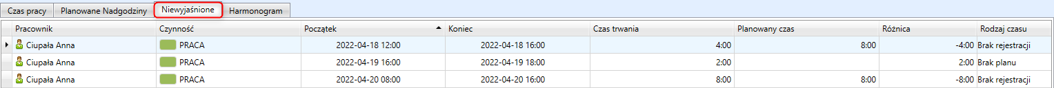- Brak rejestracji - brak rejestracji czasu pracy w odniesniu do planu zmianowego.