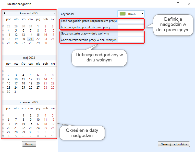 Po nacisnięciu przycisku wyświetlany jest kreator generowania nadgodzin, w którym użytkownik ma możliwość zdefiniowania paramterów nadgodzin.
