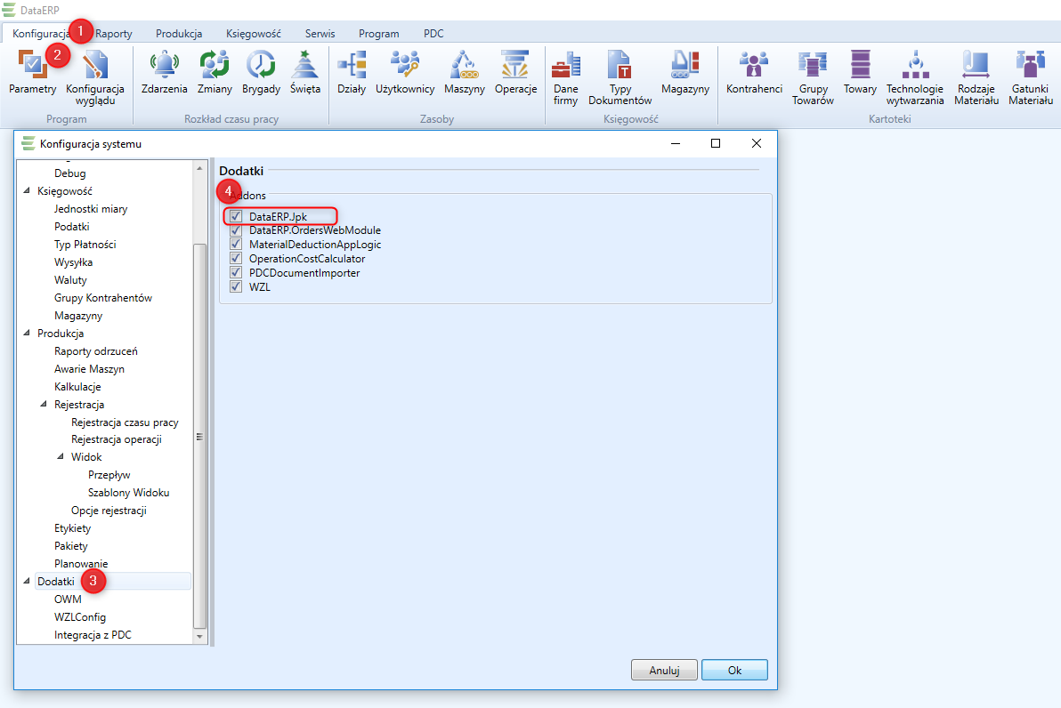 Następnie należy przejść do programu DataERP. W zakładce Konfiguracja -> Parametry -> Dodatki zaznaczyć wyżej wymienione dodatki jako aktywne.