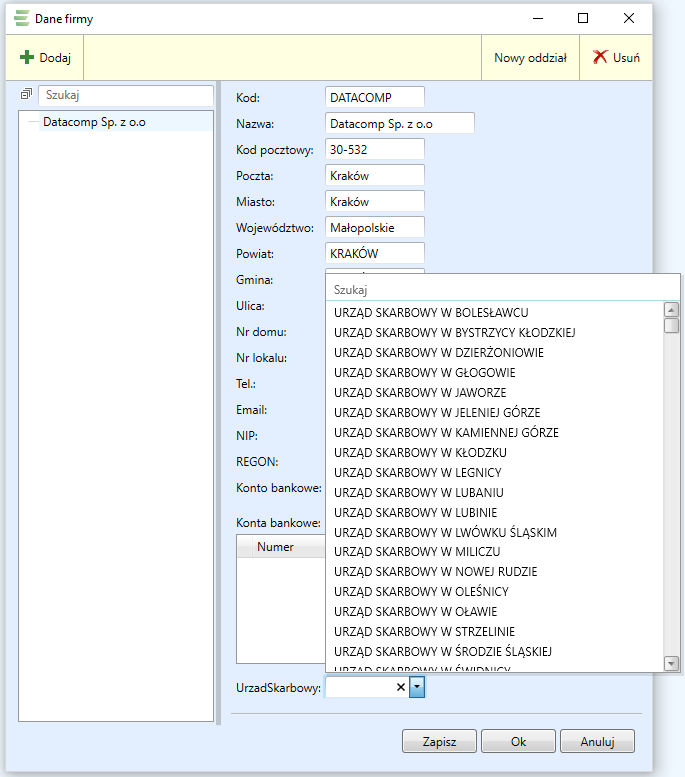 Przy tworzeniu pliku JPK niezbędne jest wskazanie kodu Urzędu Skarbowego , który informuje do którego Urzędu Skarbowego ma zostać przesłany plik JPK. W programie DataERP informację o Urzędzie Skarbowym należy uzupełnić w zakładce "Konfiguracja -> Dane firmy":