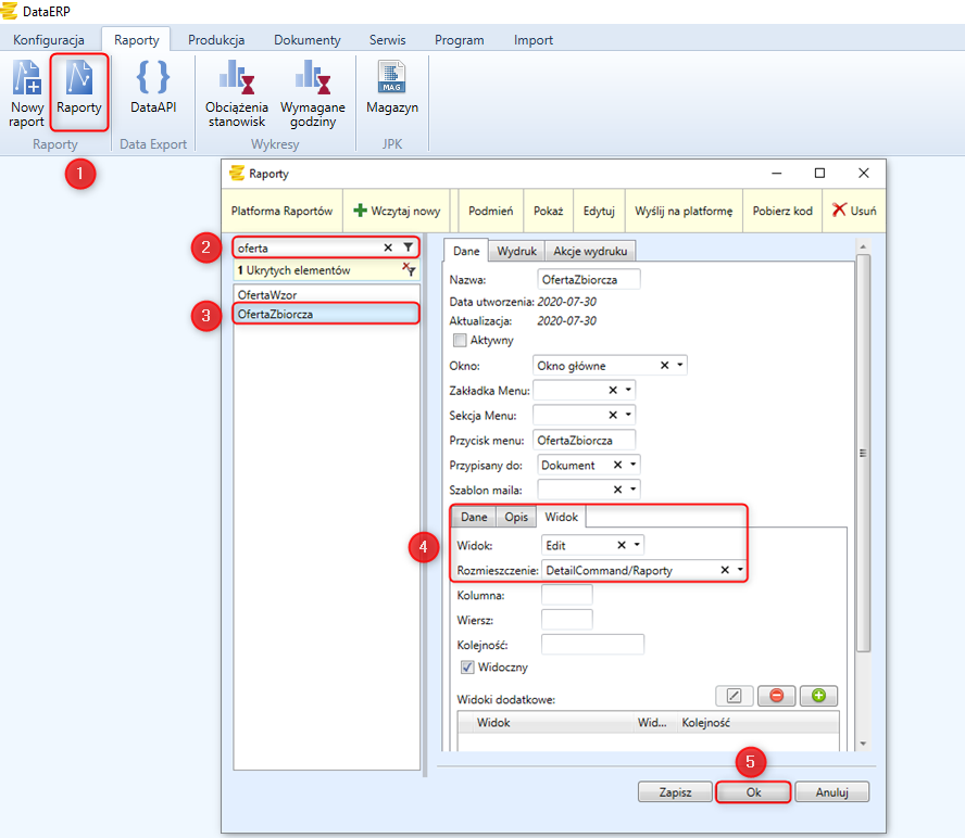 - DetailCommand/Raporty - przycisk pojawi się z prawej strony górnego paska
