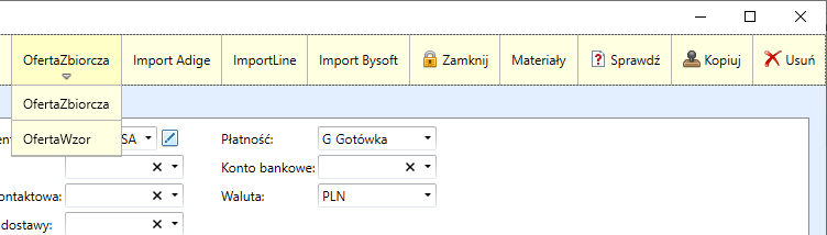 Grupowanie przycisków szablonów jest bardzo pożądaną opcją, jeżeli mamy zdefiniowanych kilka gotowych raportów lub szablonów dokumentów i chcemy nadal zachować przejrzystość interfejsu. Zgrupowany przycisk pojawi się na górnym pasku w postaci listy rozwijanej.