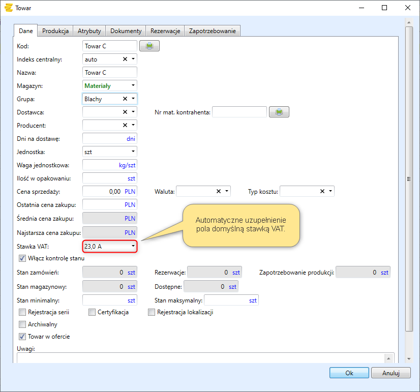 - Jeśli w karcie towarowej nie określono wartości stawki VAT dla danego towaru- program automatycznie uzupełni pole domyślną stawką ustawioną w konfiguracji Programu: