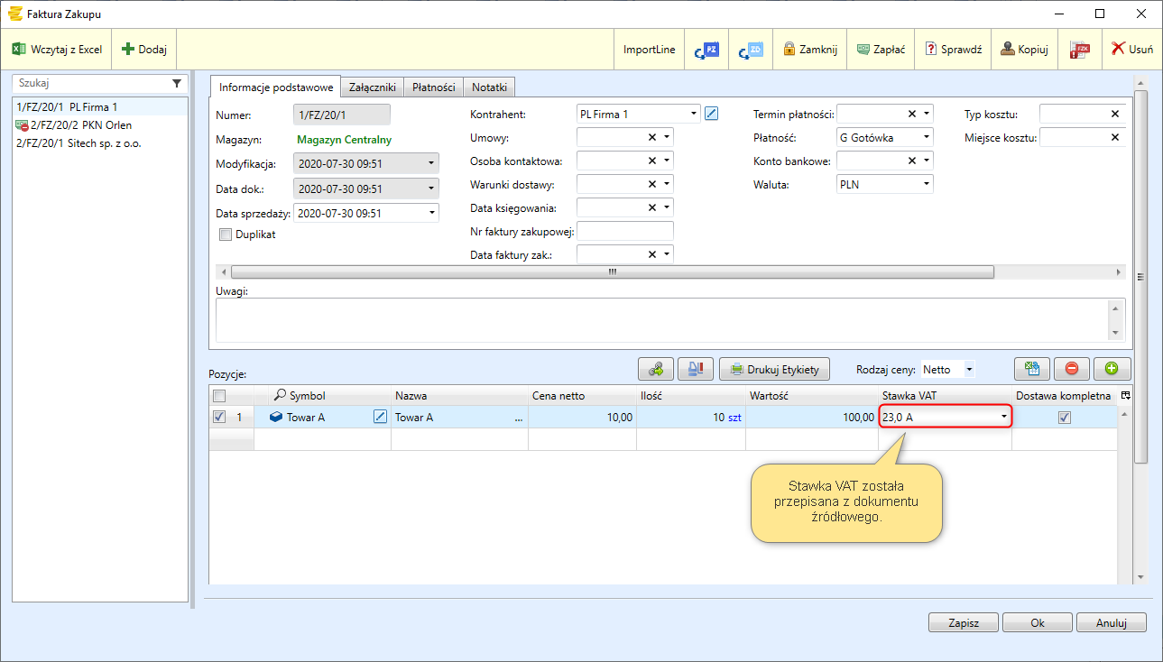 Przy takim działaniu stawka VAT na dokumencie zostanie przepisana z dokumentu źródłowego: